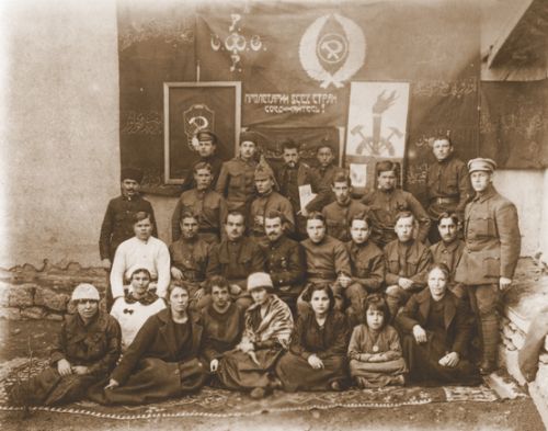 Staff of the Russian Socialist Federative Soviet Republic embassy in Ankara (Turkey, 1921), people from 10 different ethnic backgrounds - The writing says "Workers of the world unite!"
