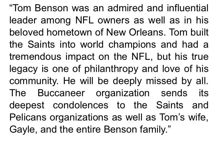"Hereβs the statement from Bucs co-chair Bryan Glazer on the passing of Saints owner Tom Benson at age 90." Courtesy of Greg Auman. pbs.twimg.com/media/DYXjmβ¦